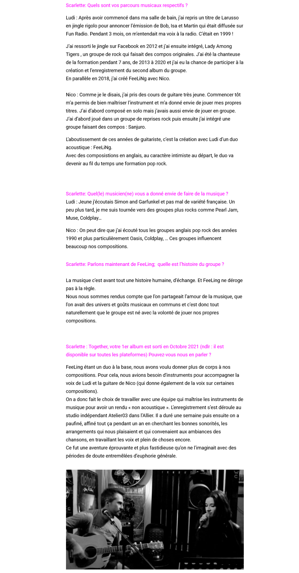 Bonjour à toutes et à tous. Le groupe s'appelle donc FeeLing. A l'origine de la formation il y a Ludi : 41 ans, génération Y et « chanteuse de salle de bain » qui est devenue chanteuse dans un vrai groupe et Nico : 41 ans passionné de musique depuis (presque) toujours et guitariste depuis longtemps.